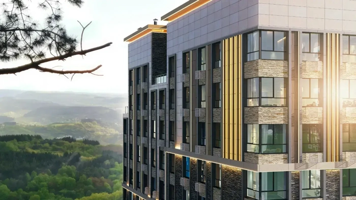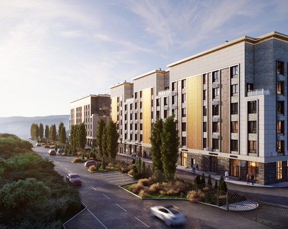 Архитектура квартала выдержана в природных тонах — беж, терракот, дикий камень, золотистые ламели. Пять шестиэтажных домов гармонично вписаны в горный ландшафт, создавая атмосферу альпийского курорта. Панорамные окна высотой 2,1 м наполняют квартиры светом и открывают виды на Кавказские горы и Эльбрус. Это эстетика, которая вдохновляет каждый день.